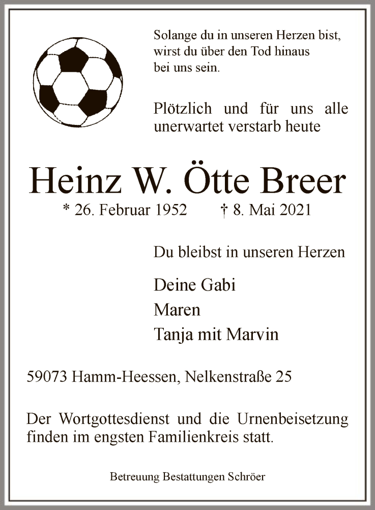Hier finden Sie alle Traueranzeigen aus der Zeitung, die bisher für Heinz W. Ötte Breer erschienen sind. Weitere Traueranzeigen, die in der Zeitung erscheinen, werden hier ebenfalls aufgelistet