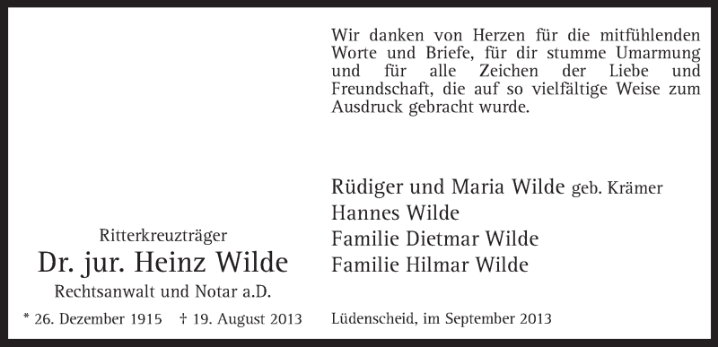 Hier finden Sie alle Traueranzeigen aus der Zeitung, die bisher für Heinz Wilde erschienen sind. Weitere Traueranzeigen, die in der Zeitung erscheinen, werden hier ebenfalls aufgelistet