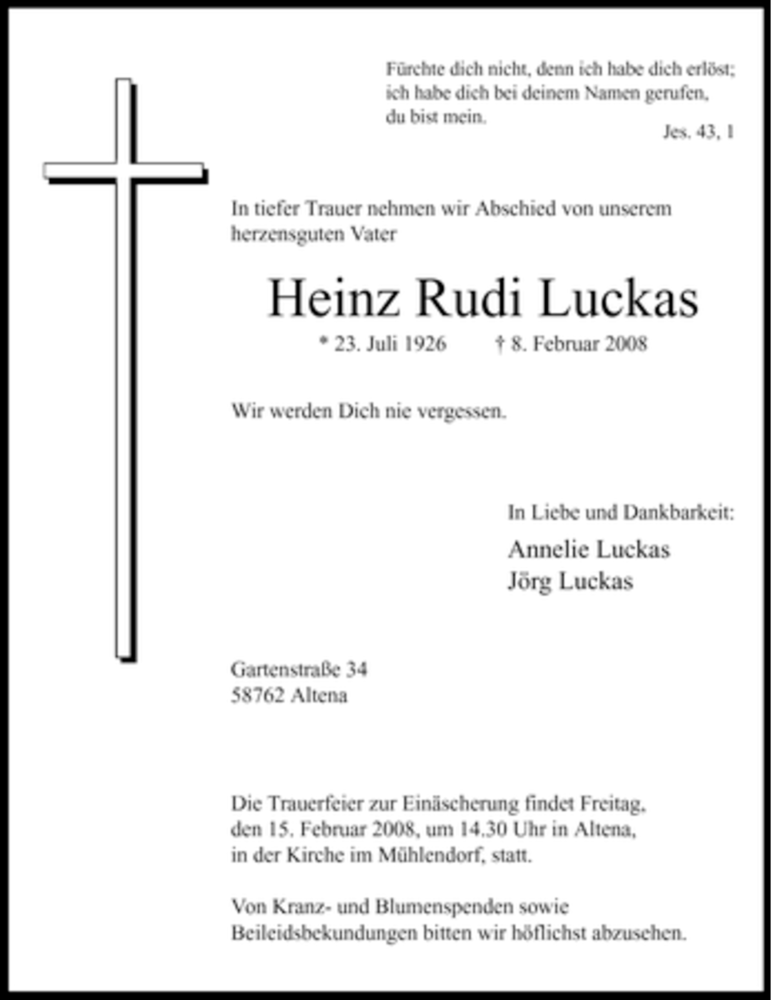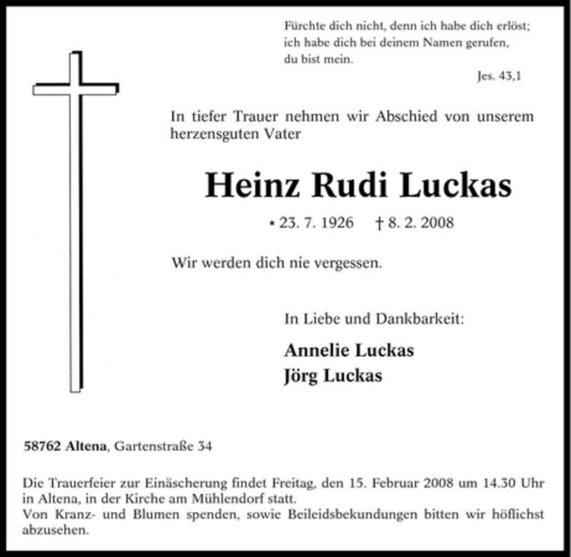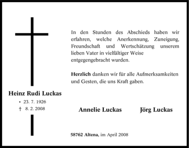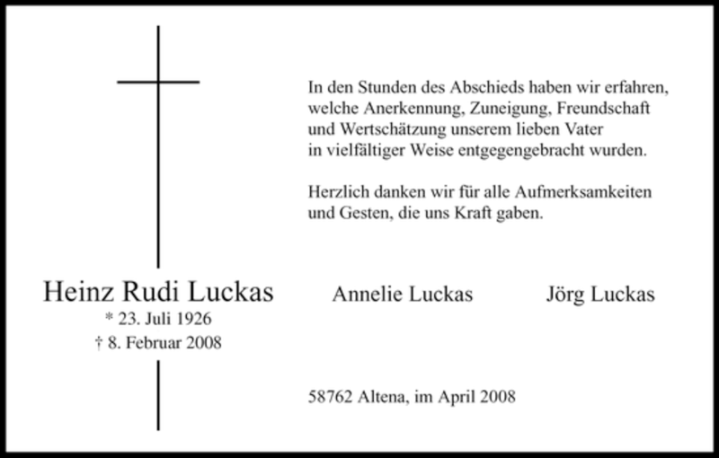 Hier finden Sie alle Traueranzeigen aus der Zeitung, die bisher für Heinz Rudi Luckas erschienen sind. Weitere Traueranzeigen, die in der Zeitung erscheinen, werden hier ebenfalls aufgelistet