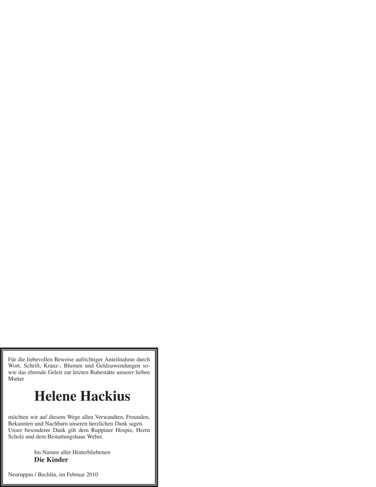 Hier finden Sie alle Traueranzeigen aus der Zeitung, die bisher für Helene Hackius erschienen sind. Weitere Traueranzeigen, die in der Zeitung erscheinen, werden hier ebenfalls aufgelistet
