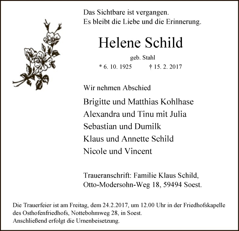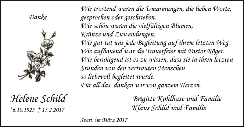 Hier finden Sie alle Traueranzeigen aus der Zeitung, die bisher für Helene Schild erschienen sind. Weitere Traueranzeigen, die in der Zeitung erscheinen, werden hier ebenfalls aufgelistet