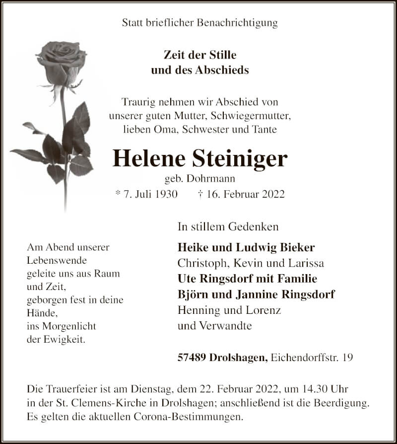 Hier finden Sie alle Traueranzeigen aus der Zeitung, die bisher für Helene Steiniger erschienen sind. Weitere Traueranzeigen, die in der Zeitung erscheinen, werden hier ebenfalls aufgelistet