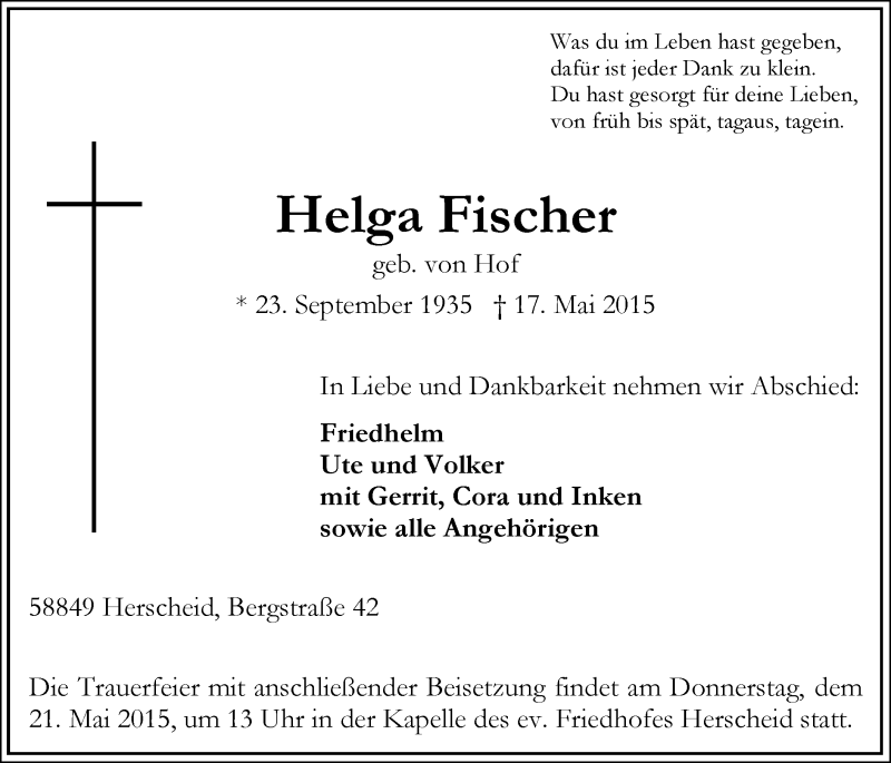 Hier finden Sie alle Traueranzeigen aus der Zeitung, die bisher für Helga Fischer erschienen sind. Weitere Traueranzeigen, die in der Zeitung erscheinen, werden hier ebenfalls aufgelistet