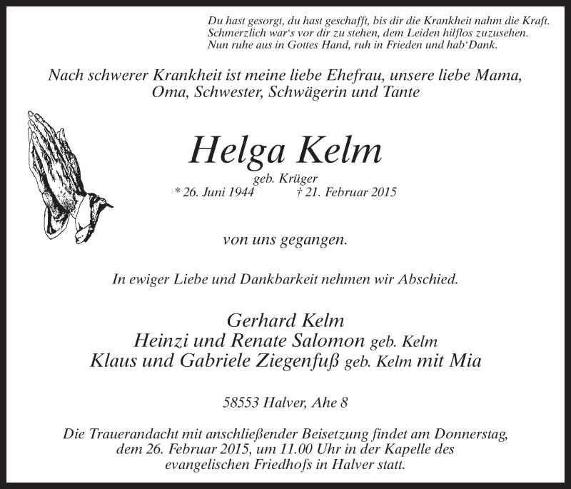 Hier finden Sie alle Traueranzeigen aus der Zeitung, die bisher für Helga Kelm erschienen sind. Weitere Traueranzeigen, die in der Zeitung erscheinen, werden hier ebenfalls aufgelistet