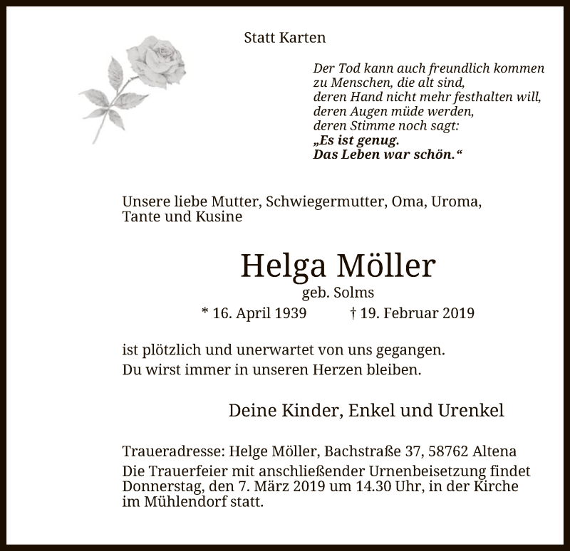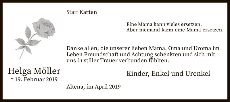 Hier finden Sie alle Traueranzeigen aus der Zeitung, die bisher für Helga Möller erschienen sind. Weitere Traueranzeigen, die in der Zeitung erscheinen, werden hier ebenfalls aufgelistet