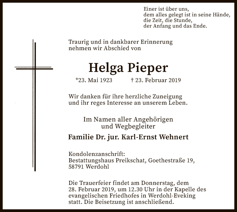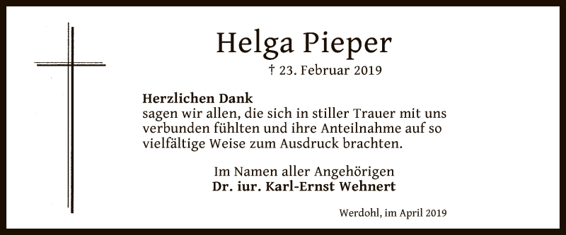 Hier finden Sie alle Traueranzeigen aus der Zeitung, die bisher für Helga Pieper erschienen sind. Weitere Traueranzeigen, die in der Zeitung erscheinen, werden hier ebenfalls aufgelistet