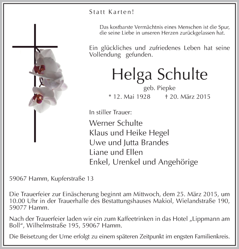 Hier finden Sie alle Traueranzeigen aus der Zeitung, die bisher für Helga Schulte erschienen sind. Weitere Traueranzeigen, die in der Zeitung erscheinen, werden hier ebenfalls aufgelistet