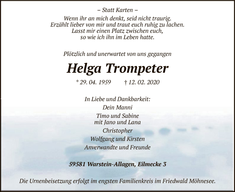 Hier finden Sie alle Traueranzeigen aus der Zeitung, die bisher für Helga Trompeter erschienen sind. Weitere Traueranzeigen, die in der Zeitung erscheinen, werden hier ebenfalls aufgelistet