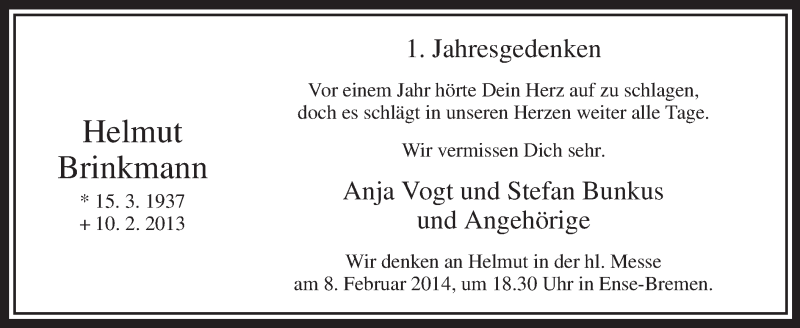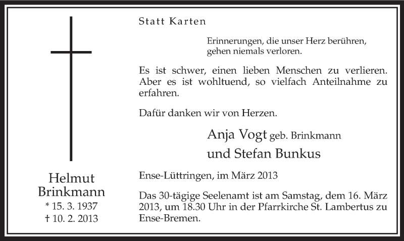 Hier finden Sie alle Traueranzeigen aus der Zeitung, die bisher für Helmut Brinkmann erschienen sind. Weitere Traueranzeigen, die in der Zeitung erscheinen, werden hier ebenfalls aufgelistet