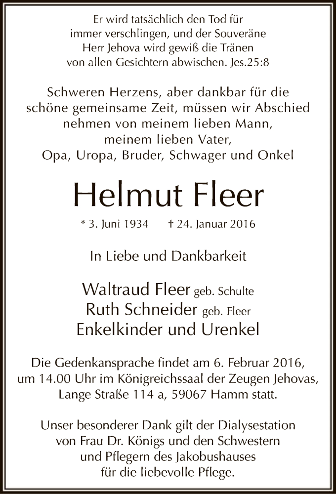Hier finden Sie alle Traueranzeigen aus der Zeitung, die bisher für Helmut Fleer erschienen sind. Weitere Traueranzeigen, die in der Zeitung erscheinen, werden hier ebenfalls aufgelistet