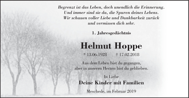 Hier finden Sie alle Traueranzeigen aus der Zeitung, die bisher für Helmut Hoppe erschienen sind. Weitere Traueranzeigen, die in der Zeitung erscheinen, werden hier ebenfalls aufgelistet