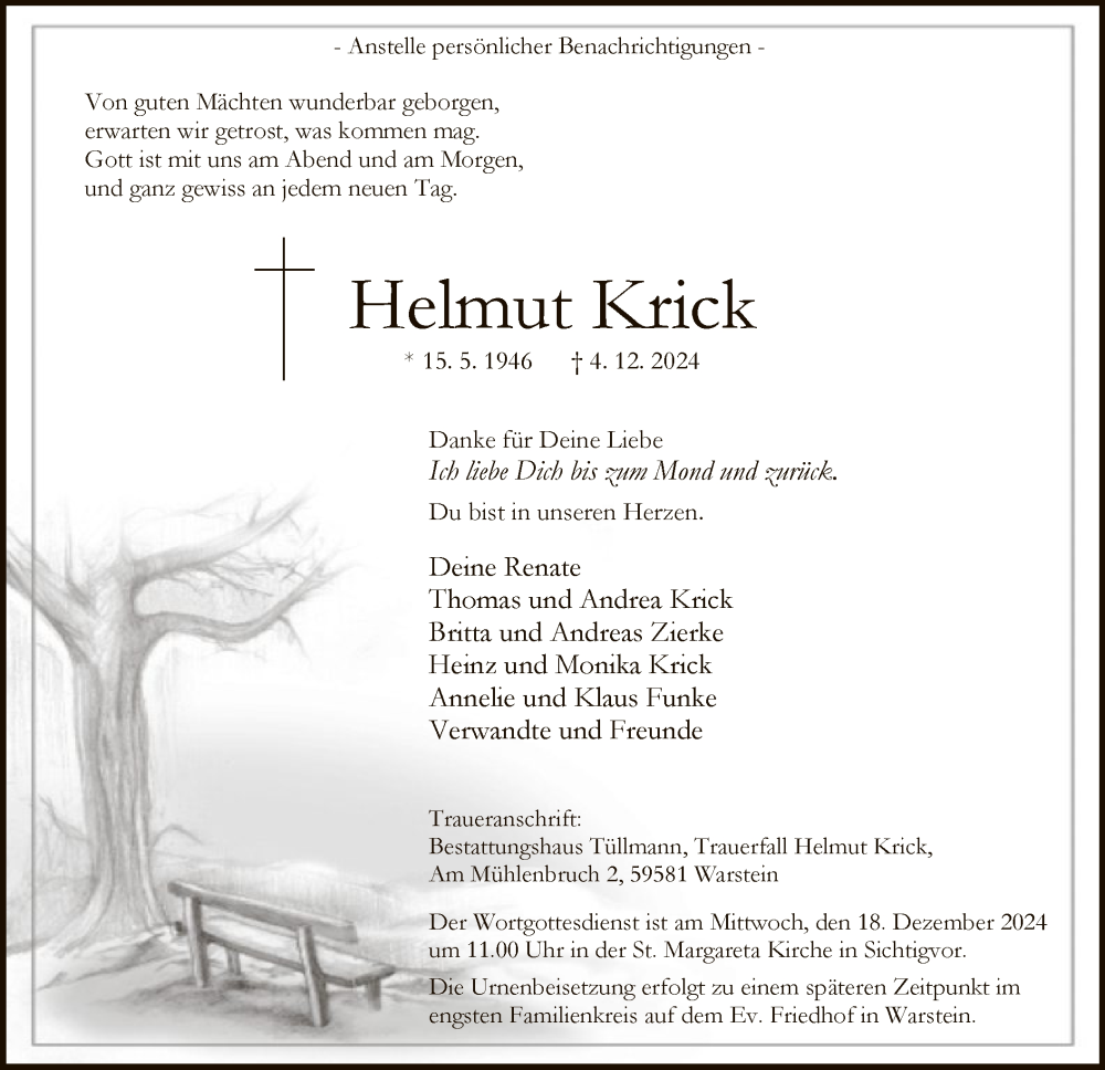 Hier finden Sie alle Traueranzeigen aus der Zeitung, die bisher für Helmut Krick erschienen sind. Weitere Traueranzeigen, die in der Zeitung erscheinen, werden hier ebenfalls aufgelistet