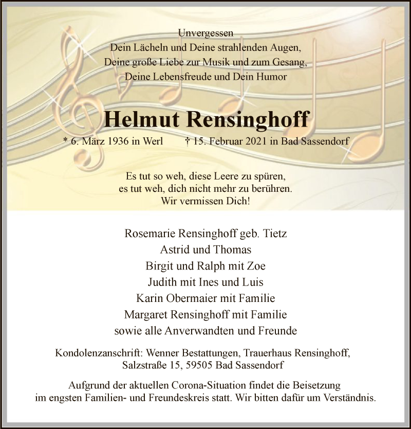 Hier finden Sie alle Traueranzeigen aus der Zeitung, die bisher für Helmut Rensinghoff erschienen sind. Weitere Traueranzeigen, die in der Zeitung erscheinen, werden hier ebenfalls aufgelistet