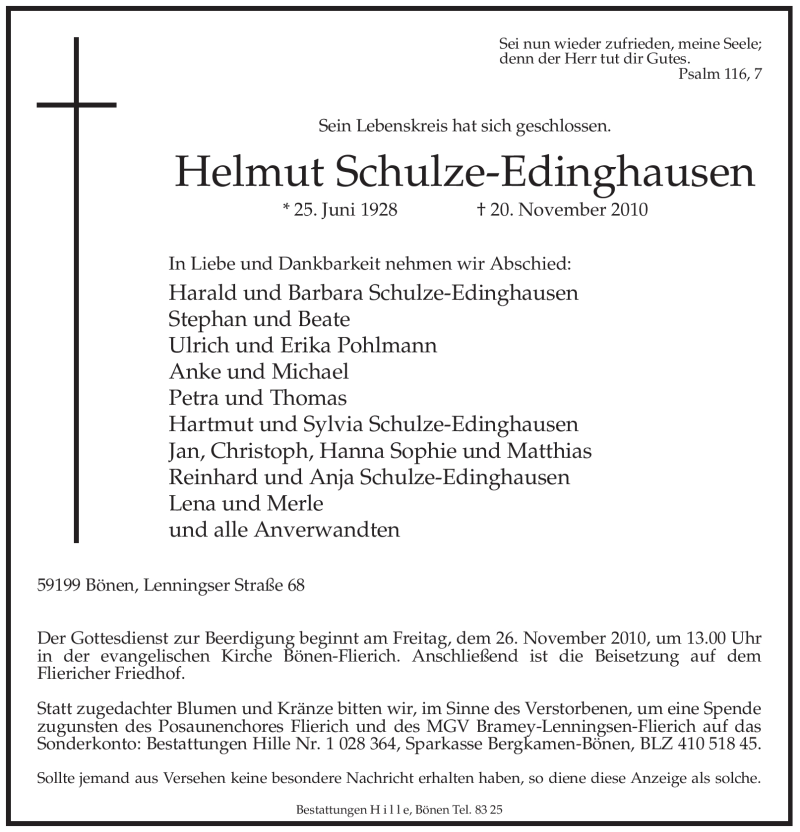 Hier finden Sie alle Traueranzeigen aus der Zeitung, die bisher für Helmut Schulze-Edinghausen erschienen sind. Weitere Traueranzeigen, die in der Zeitung erscheinen, werden hier ebenfalls aufgelistet
