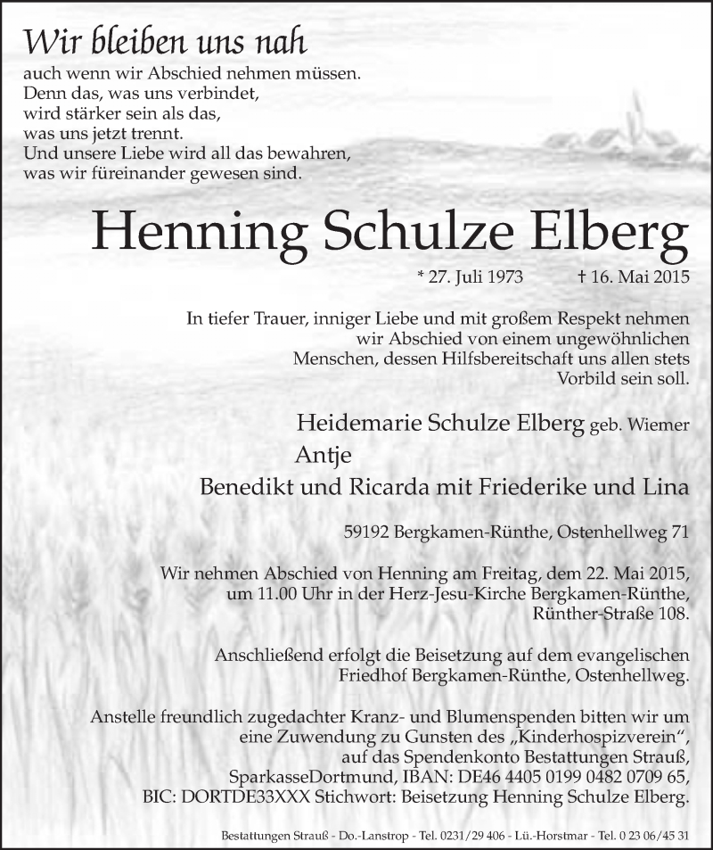 Hier finden Sie alle Traueranzeigen aus der Zeitung, die bisher für Henning Schulze Elberg erschienen sind. Weitere Traueranzeigen, die in der Zeitung erscheinen, werden hier ebenfalls aufgelistet