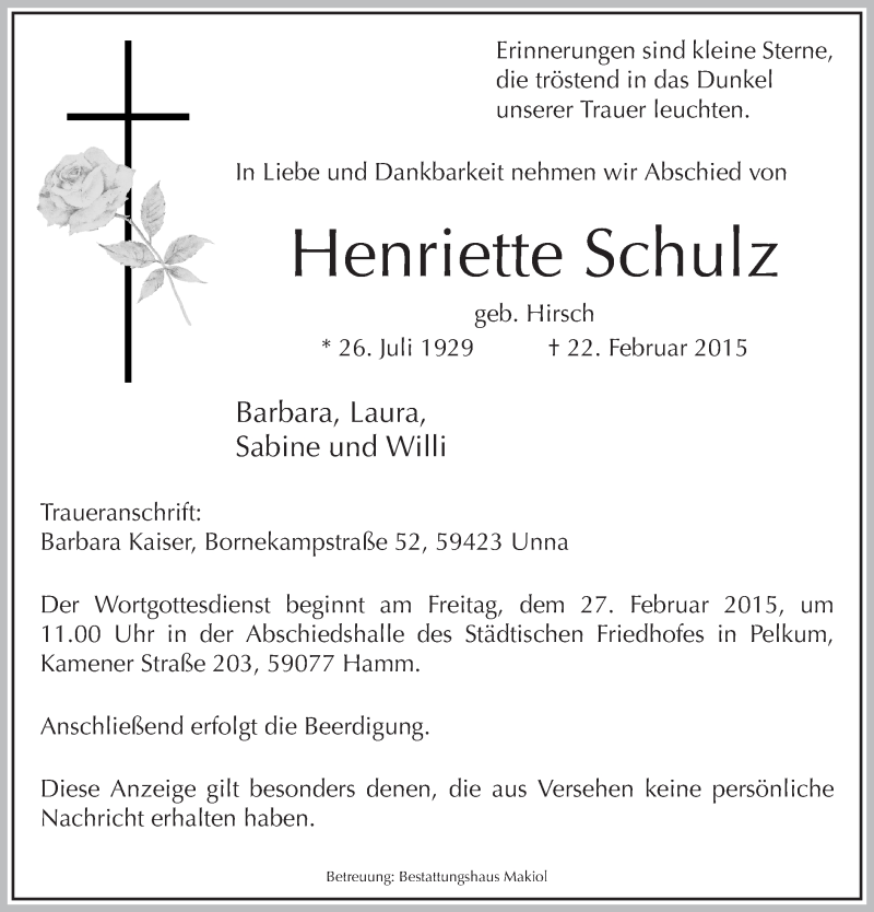 Hier finden Sie alle Traueranzeigen aus der Zeitung, die bisher für Henriette Schulz erschienen sind. Weitere Traueranzeigen, die in der Zeitung erscheinen, werden hier ebenfalls aufgelistet