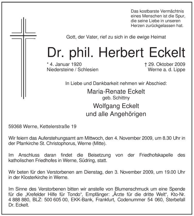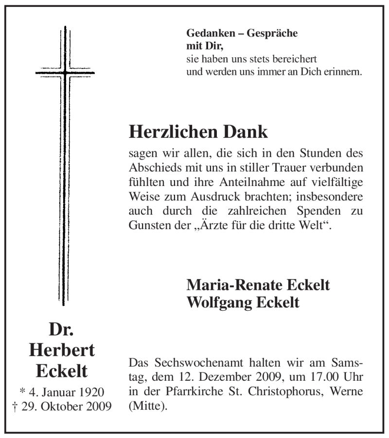 Hier finden Sie alle Traueranzeigen aus der Zeitung, die bisher für Herbert Eckelt erschienen sind. Weitere Traueranzeigen, die in der Zeitung erscheinen, werden hier ebenfalls aufgelistet