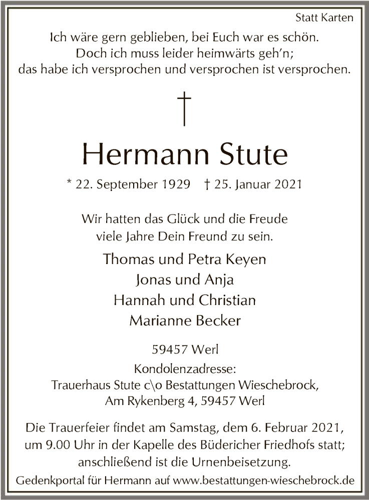 Hier finden Sie alle Traueranzeigen aus der Zeitung, die bisher für Hermann Stute erschienen sind. Weitere Traueranzeigen, die in der Zeitung erscheinen, werden hier ebenfalls aufgelistet