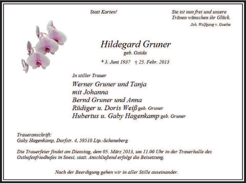 Hier finden Sie alle Traueranzeigen aus der Zeitung, die bisher für Hildegard Gruner erschienen sind. Weitere Traueranzeigen, die in der Zeitung erscheinen, werden hier ebenfalls aufgelistet
