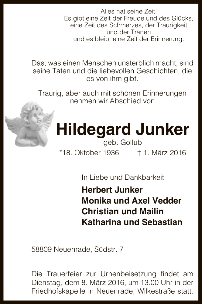 Hier finden Sie alle Traueranzeigen aus der Zeitung, die bisher für Hildegard Junker erschienen sind. Weitere Traueranzeigen, die in der Zeitung erscheinen, werden hier ebenfalls aufgelistet