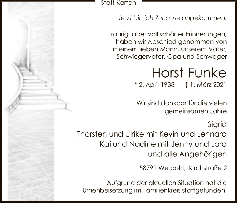 Hier finden Sie alle Traueranzeigen aus der Zeitung, die bisher für Horst Funke erschienen sind. Weitere Traueranzeigen, die in der Zeitung erscheinen, werden hier ebenfalls aufgelistet