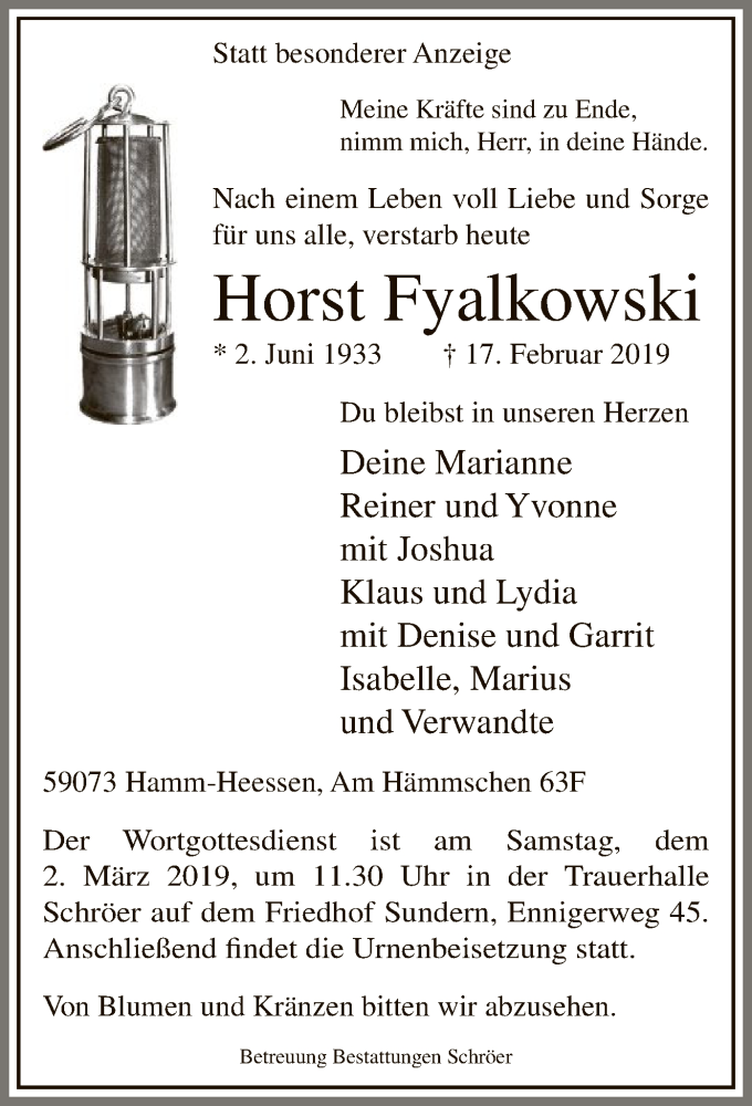 Hier finden Sie alle Traueranzeigen aus der Zeitung, die bisher für Horst Fyalkowski erschienen sind. Weitere Traueranzeigen, die in der Zeitung erscheinen, werden hier ebenfalls aufgelistet