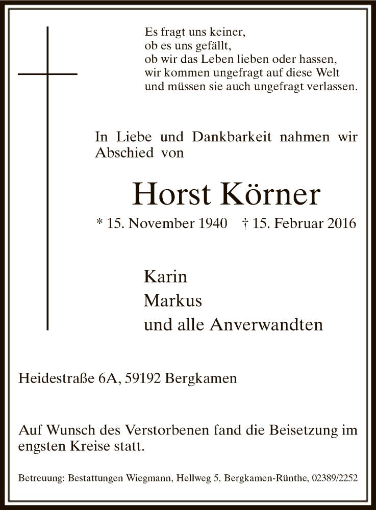 Hier finden Sie alle Traueranzeigen aus der Zeitung, die bisher für Horst Körner erschienen sind. Weitere Traueranzeigen, die in der Zeitung erscheinen, werden hier ebenfalls aufgelistet