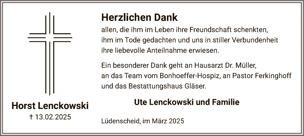 Hier finden Sie alle Traueranzeigen aus der Zeitung, die bisher für Horst Lenckowski erschienen sind. Weitere Traueranzeigen, die in der Zeitung erscheinen, werden hier ebenfalls aufgelistet