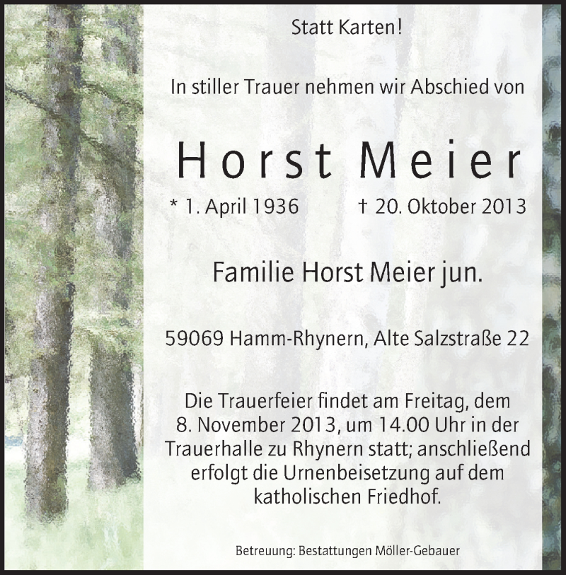 Hier finden Sie alle Traueranzeigen aus der Zeitung, die bisher für Horst Meier erschienen sind. Weitere Traueranzeigen, die in der Zeitung erscheinen, werden hier ebenfalls aufgelistet