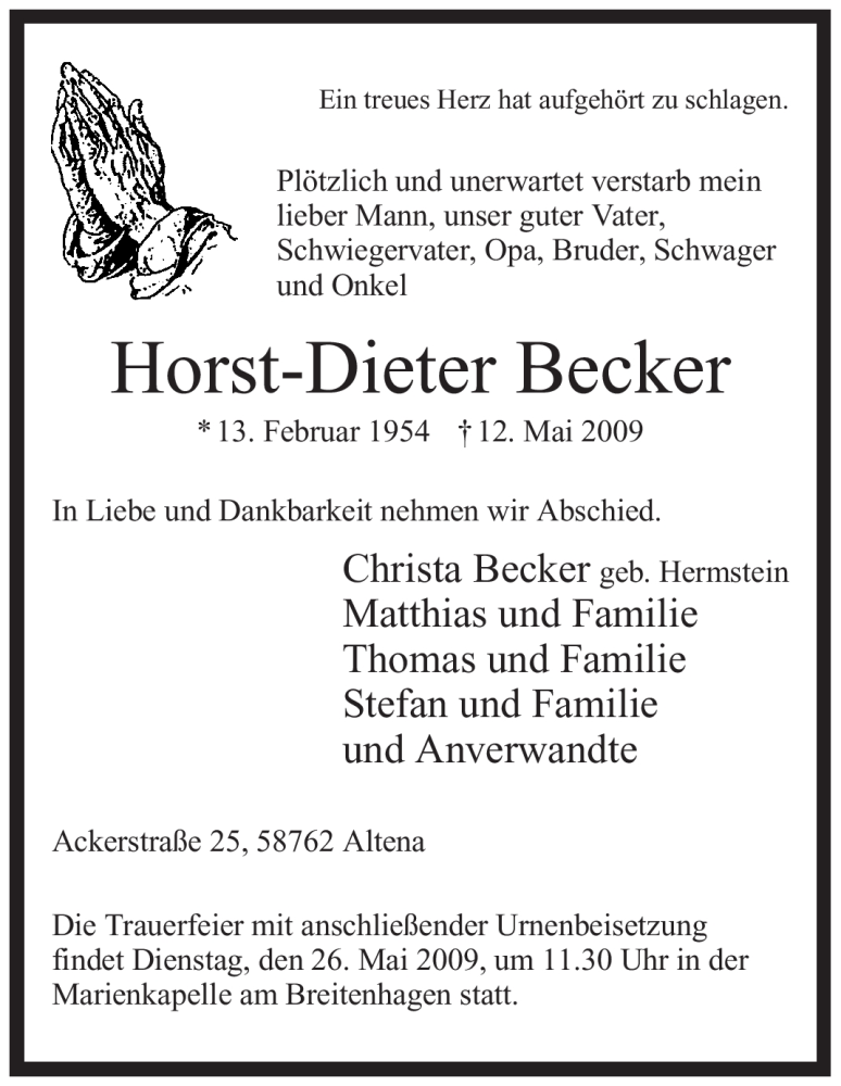Hier finden Sie alle Traueranzeigen aus der Zeitung, die bisher für Horst - Dieter Becker erschienen sind. Weitere Traueranzeigen, die in der Zeitung erscheinen, werden hier ebenfalls aufgelistet