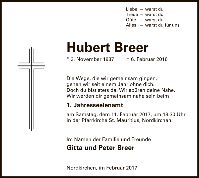 Hier finden Sie alle Traueranzeigen aus der Zeitung, die bisher für Hubert Breer erschienen sind. Weitere Traueranzeigen, die in der Zeitung erscheinen, werden hier ebenfalls aufgelistet