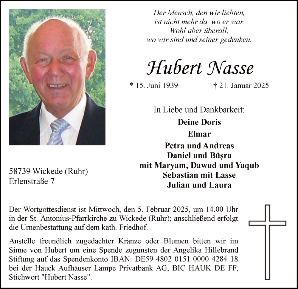 Hier finden Sie alle Traueranzeigen aus der Zeitung, die bisher für Hubert Nasse erschienen sind. Weitere Traueranzeigen, die in der Zeitung erscheinen, werden hier ebenfalls aufgelistet