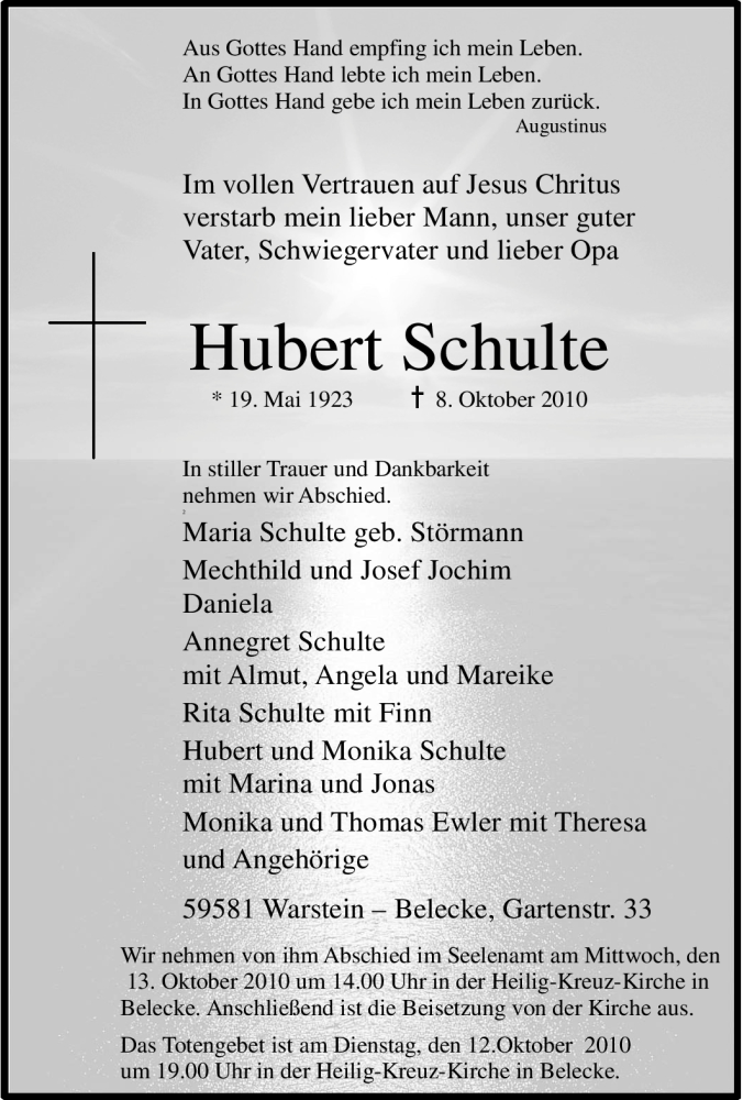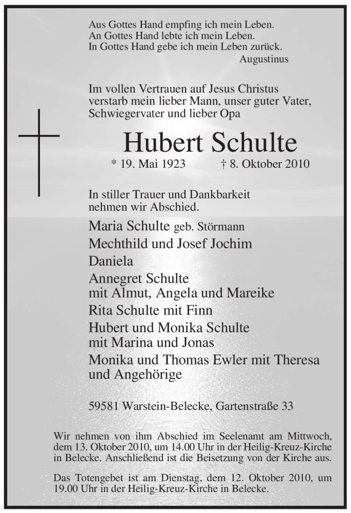 Hier finden Sie alle Traueranzeigen aus der Zeitung, die bisher für Hubert Schulte erschienen sind. Weitere Traueranzeigen, die in der Zeitung erscheinen, werden hier ebenfalls aufgelistet
