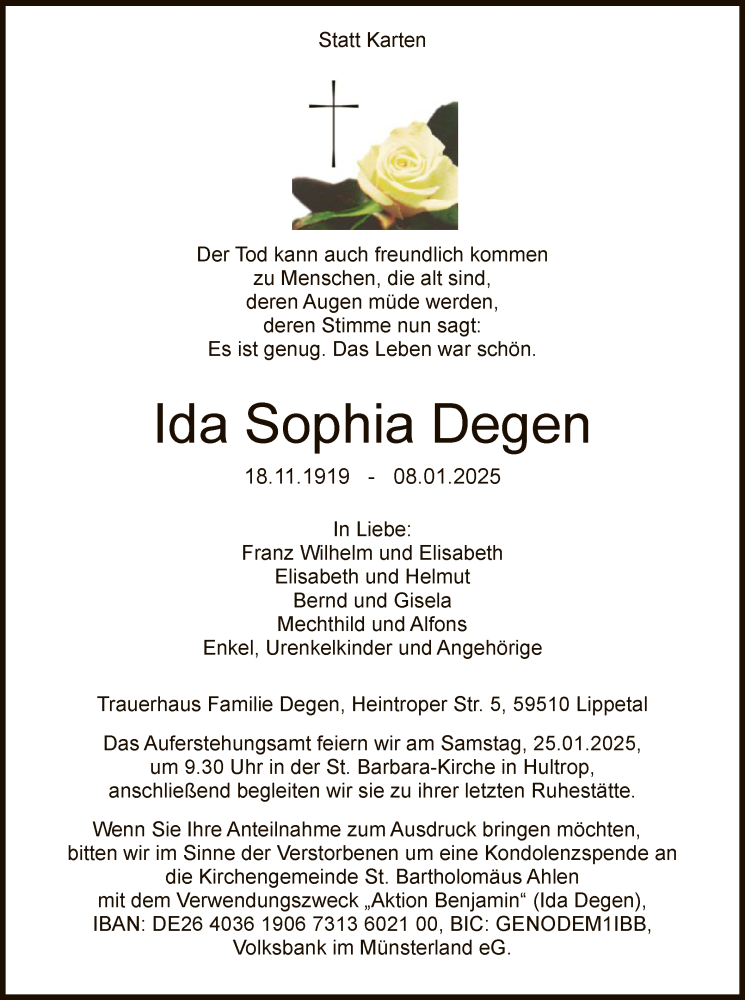 Hier finden Sie alle Traueranzeigen aus der Zeitung, die bisher für Ida Sophia Degen erschienen sind. Weitere Traueranzeigen, die in der Zeitung erscheinen, werden hier ebenfalls aufgelistet