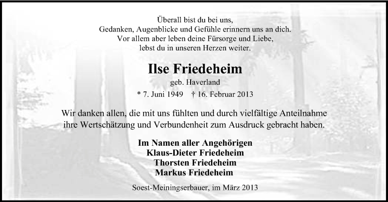 Hier finden Sie alle Traueranzeigen aus der Zeitung, die bisher für Ilse Friedeheim erschienen sind. Weitere Traueranzeigen, die in der Zeitung erscheinen, werden hier ebenfalls aufgelistet