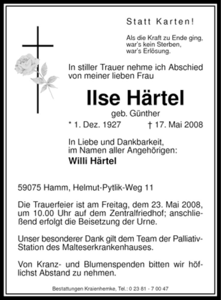 Hier finden Sie alle Traueranzeigen aus der Zeitung, die bisher für Ilse Härtel erschienen sind. Weitere Traueranzeigen, die in der Zeitung erscheinen, werden hier ebenfalls aufgelistet