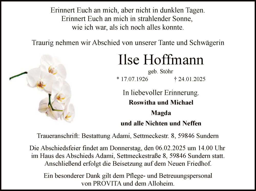 Hier finden Sie alle Traueranzeigen aus der Zeitung, die bisher für Ilse Hoffmann erschienen sind. Weitere Traueranzeigen, die in der Zeitung erscheinen, werden hier ebenfalls aufgelistet