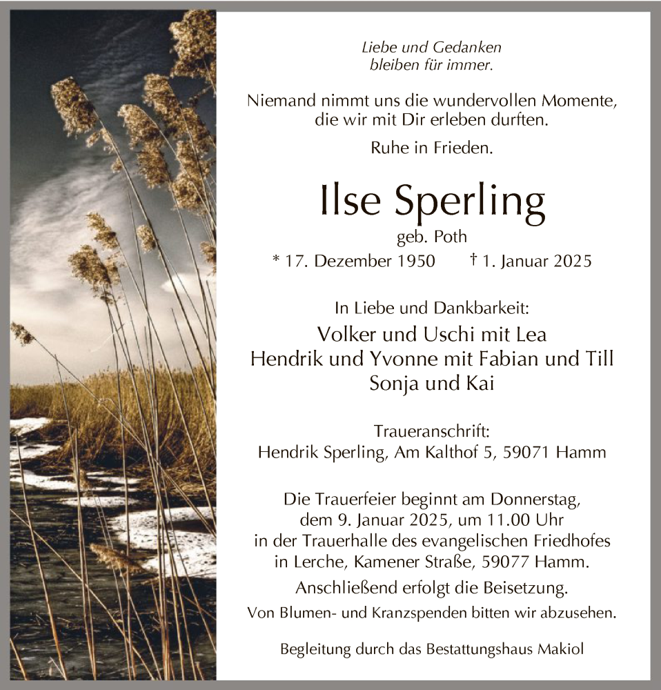 Hier finden Sie alle Traueranzeigen aus der Zeitung, die bisher für Ilse Sperling erschienen sind. Weitere Traueranzeigen, die in der Zeitung erscheinen, werden hier ebenfalls aufgelistet