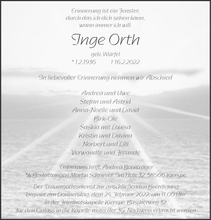 Hier finden Sie alle Traueranzeigen aus der Zeitung, die bisher für Inge Orth erschienen sind. Weitere Traueranzeigen, die in der Zeitung erscheinen, werden hier ebenfalls aufgelistet