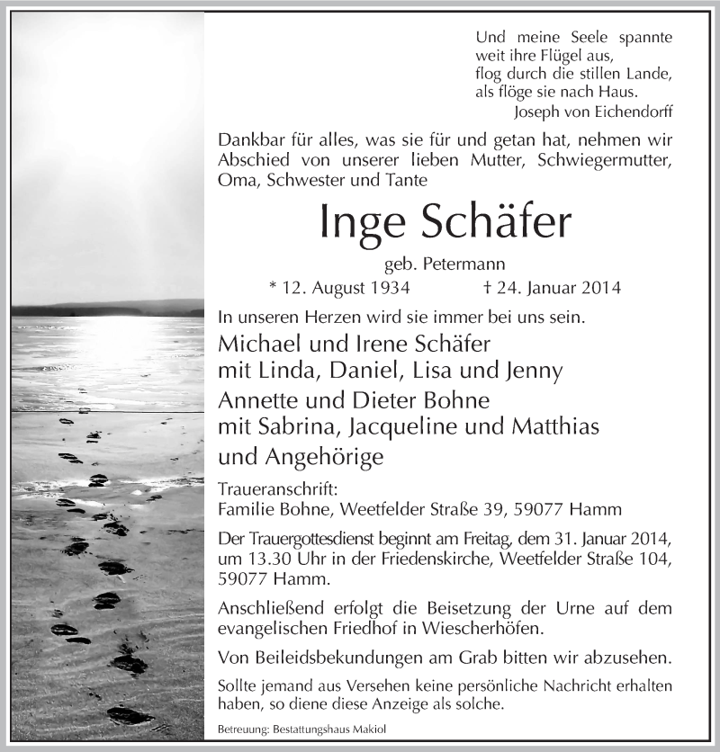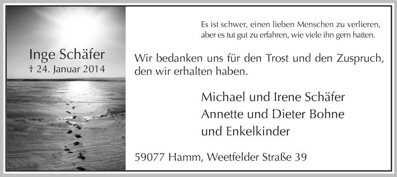 Hier finden Sie alle Traueranzeigen aus der Zeitung, die bisher für Inge Schäfer erschienen sind. Weitere Traueranzeigen, die in der Zeitung erscheinen, werden hier ebenfalls aufgelistet