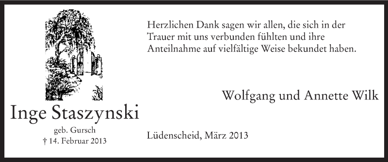 Hier finden Sie alle Traueranzeigen aus der Zeitung, die bisher für Inge Staszynski erschienen sind. Weitere Traueranzeigen, die in der Zeitung erscheinen, werden hier ebenfalls aufgelistet