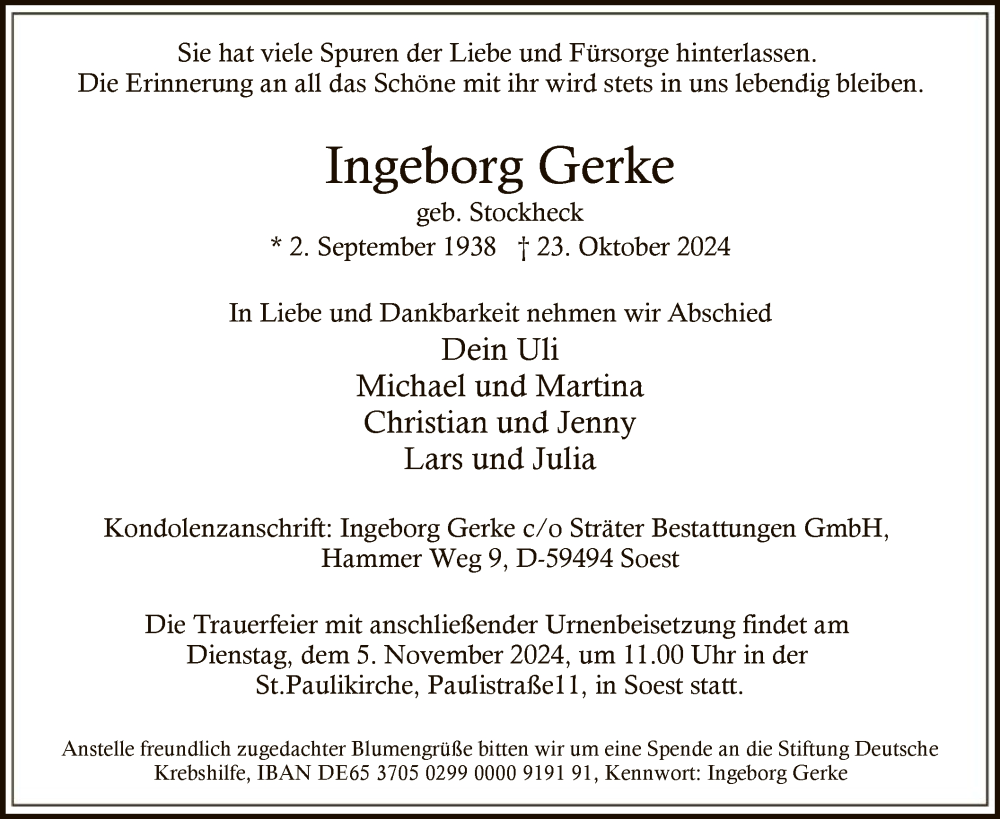 Hier finden Sie alle Traueranzeigen aus der Zeitung, die bisher für Ingeborg Gerke erschienen sind. Weitere Traueranzeigen, die in der Zeitung erscheinen, werden hier ebenfalls aufgelistet