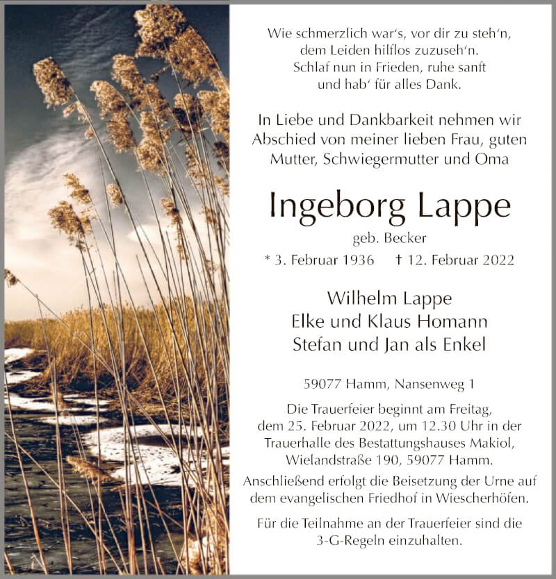 Hier finden Sie alle Traueranzeigen aus der Zeitung, die bisher für Ingeborg Lappe erschienen sind. Weitere Traueranzeigen, die in der Zeitung erscheinen, werden hier ebenfalls aufgelistet