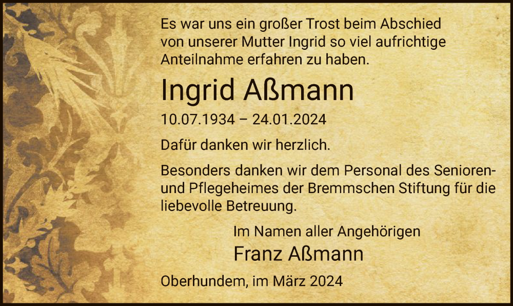 Hier finden Sie alle Traueranzeigen aus der Zeitung, die bisher für Ingrid Aßmann erschienen sind. Weitere Traueranzeigen, die in der Zeitung erscheinen, werden hier ebenfalls aufgelistet