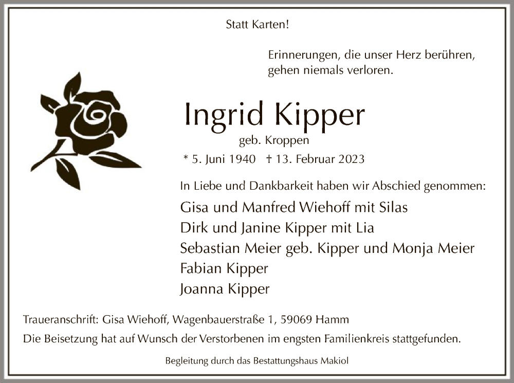 Hier finden Sie alle Traueranzeigen aus der Zeitung, die bisher für Ingrid Kipper erschienen sind. Weitere Traueranzeigen, die in der Zeitung erscheinen, werden hier ebenfalls aufgelistet