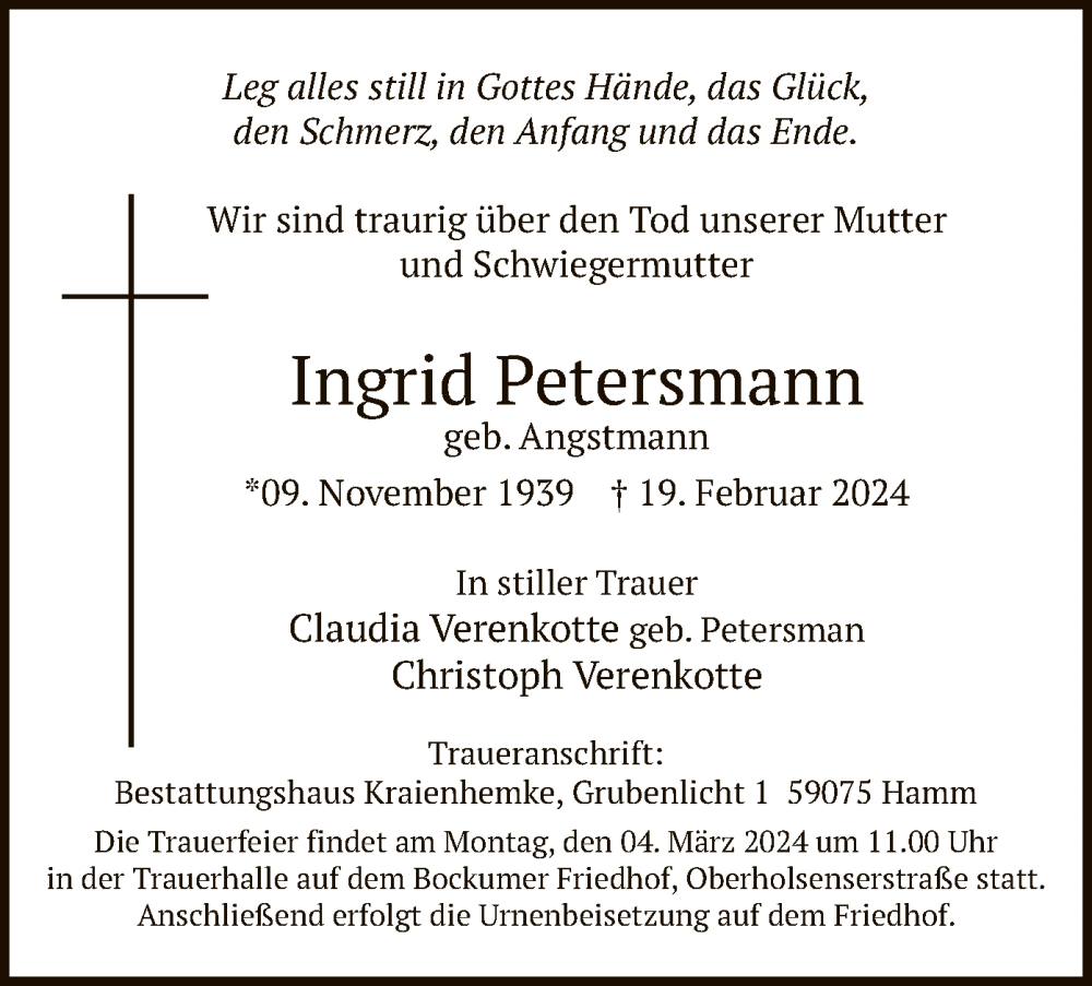 Hier finden Sie alle Traueranzeigen aus der Zeitung, die bisher für Ingrid Petersmann erschienen sind. Weitere Traueranzeigen, die in der Zeitung erscheinen, werden hier ebenfalls aufgelistet