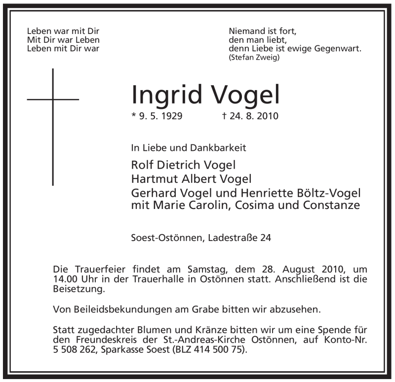 Hier finden Sie alle Traueranzeigen aus der Zeitung, die bisher für Ingrid Vogel erschienen sind. Weitere Traueranzeigen, die in der Zeitung erscheinen, werden hier ebenfalls aufgelistet