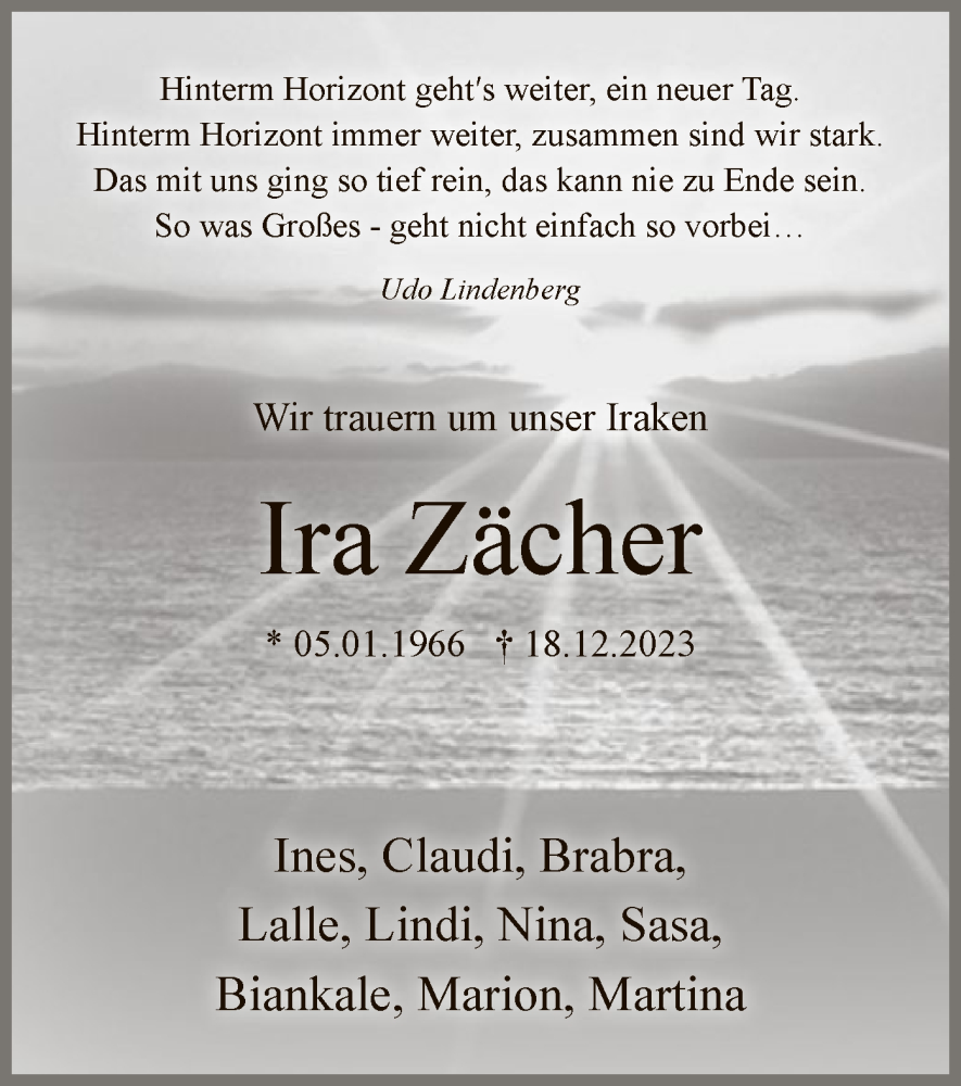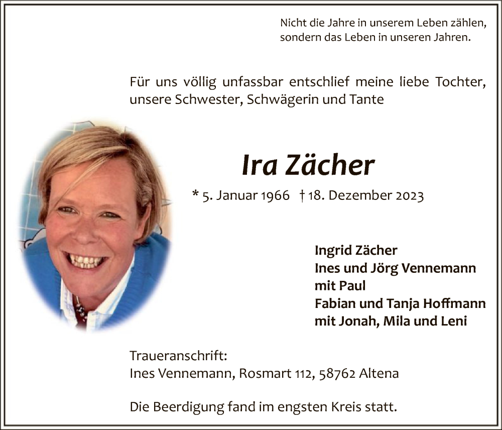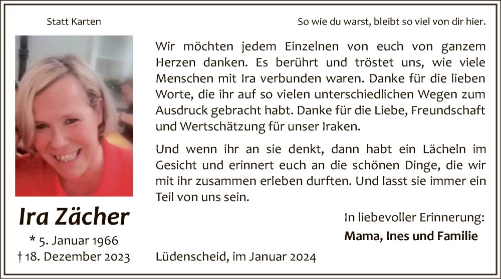 Hier finden Sie alle Traueranzeigen aus der Zeitung, die bisher für Ira Zächer erschienen sind. Weitere Traueranzeigen, die in der Zeitung erscheinen, werden hier ebenfalls aufgelistet
