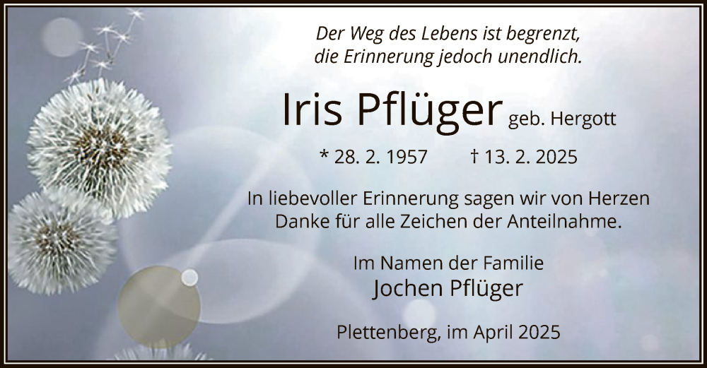Hier finden Sie alle Traueranzeigen aus der Zeitung, die bisher für Iris Pflüger erschienen sind. Weitere Traueranzeigen, die in der Zeitung erscheinen, werden hier ebenfalls aufgelistet