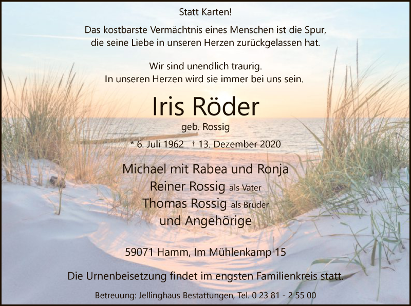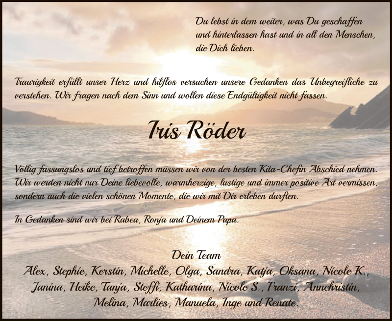 Hier finden Sie alle Traueranzeigen aus der Zeitung, die bisher für Iris Röder erschienen sind. Weitere Traueranzeigen, die in der Zeitung erscheinen, werden hier ebenfalls aufgelistet